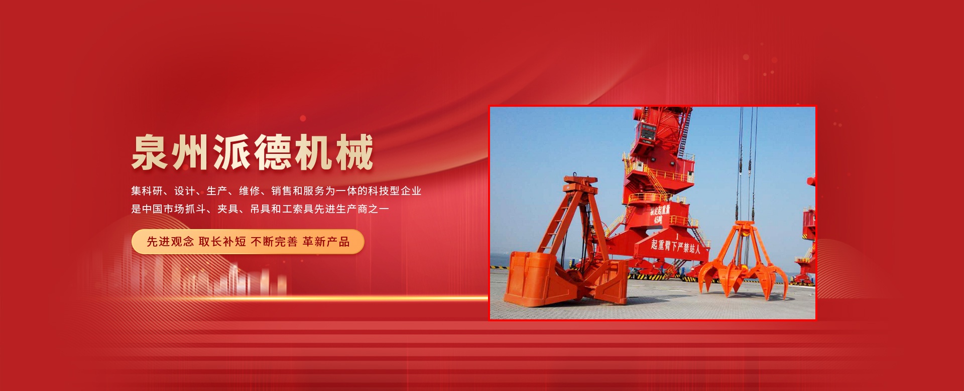 泉州派德機械有限公司成立于2012年5月,位于全國文明的古城福建泉州,公司擁有各類型專業(yè)員工82人,其中高級工程師1人,工程師4人,助理工程師5人,是一家集科研、設計、生產、維修、銷售和服務為一體的科技型企業(yè),是中國市場抓斗、夾具、吊具和工索具先進生產商之一。產品采用國內外先進的設計方案、技術規(guī)范、制造過程、工藝流程和服務,憑借在抓斗、夾具、吊具和工索具領域的超前設計理念和成熟的技術、工藝和管理,在抓具領域迅速崛起。